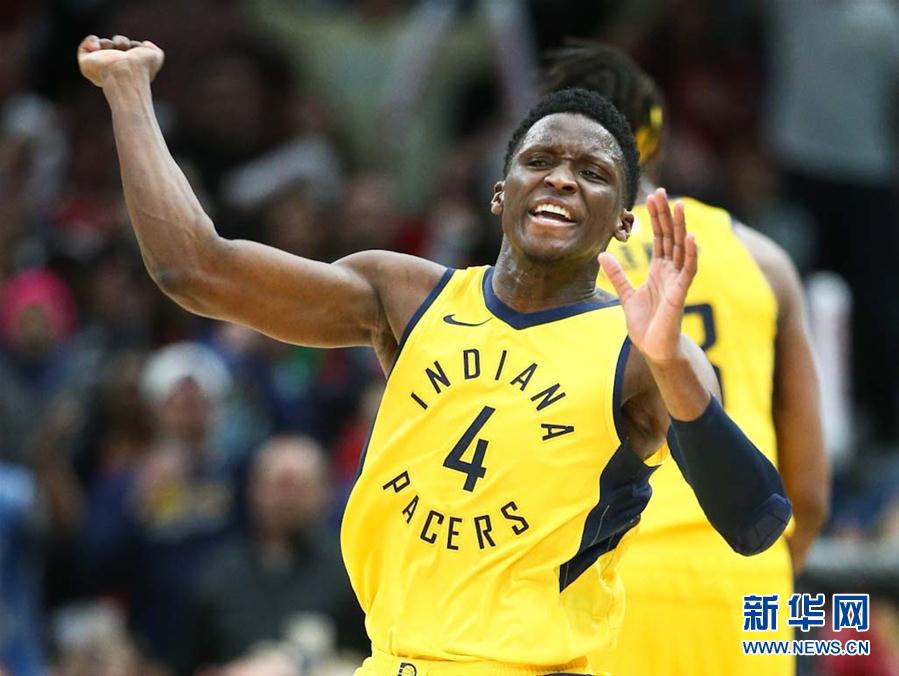 11月2日,步行者队球员奥拉迪波庆祝获胜。 当日,在2018-2019赛季NBA常规赛中,印第安纳步行者队客场以107比105战胜芝加哥公牛队。 新华社发(乔尔・莱纳摄)