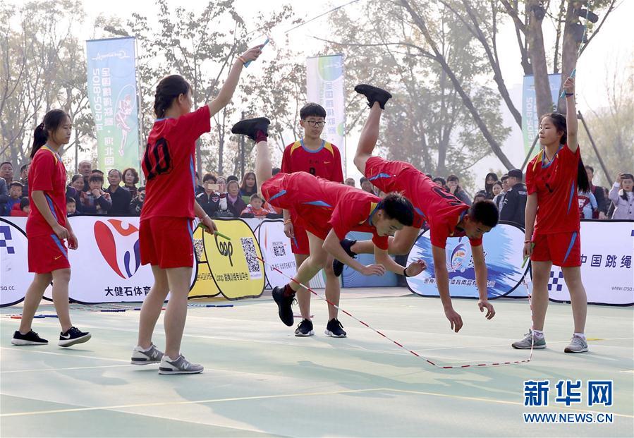 11月3日,山东东营市垦利区黄河口中学代表队在集体自编赛中。 当日,2018-2019全国跳绳联赛固安站在河北固安举行。比赛吸引了来自全国各地的38支代表队450多名选手参加。 新华社记者王晓摄