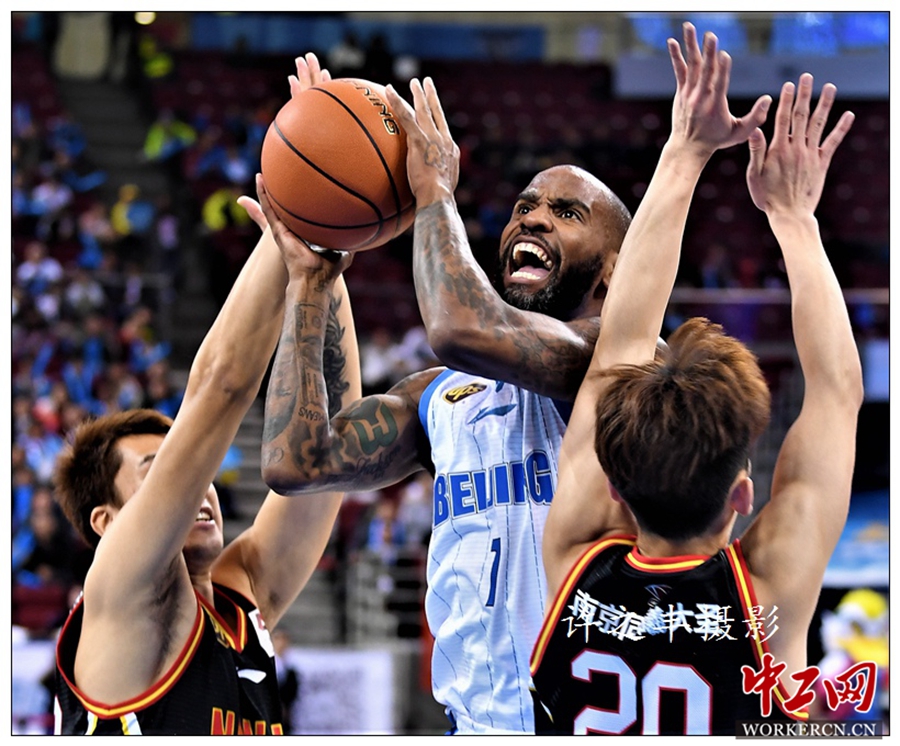 2018年11月4日晚,CBA联赛第七轮比赛,北京首钢队凭借着末节的出色发挥以114比102战胜南京同曦队,结束了三连败,主场获得首场胜利。工人日报-中工网记者许之丰摄影报道