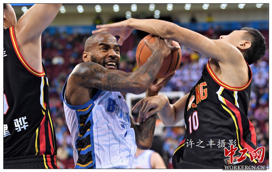 2018年11月4日晚,CBA联赛第七轮比赛,北京首钢队凭借着末节的出色发挥以114比102战胜南京同曦队,结束了三连败,主场获得首场胜利。工人日报-中工网记者许之丰摄影报道