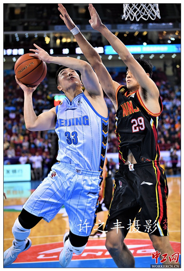 2018年11月4日晚,CBA联赛第七轮比赛,北京首钢队凭借着末节的出色发挥以114比102战胜南京同曦队,结束了三连败,主场获得首场胜利。工人日报-中工网记者许之丰摄影报道