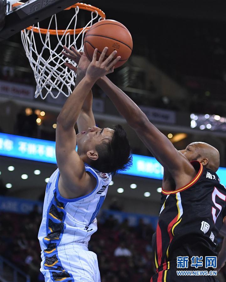 北京首钢队球员王旭(左)在比赛中突破上篮受阻。新华社记者 张晨霖 摄