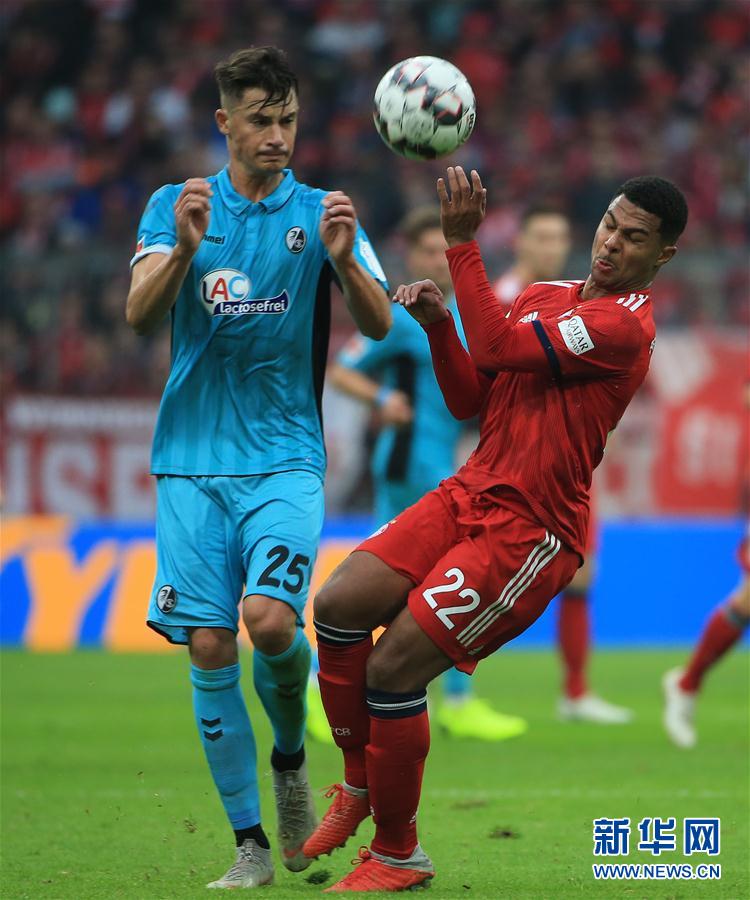 拜仁慕尼黑队球员格纳布里(右)与弗赖堡队球员科赫在比赛中拼抢。 新华社发