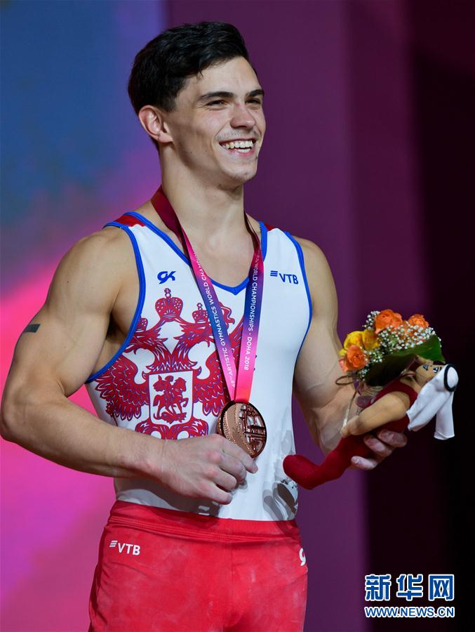 俄罗斯选手达拉洛扬在男子双杠决赛颁奖仪式上 新华社发