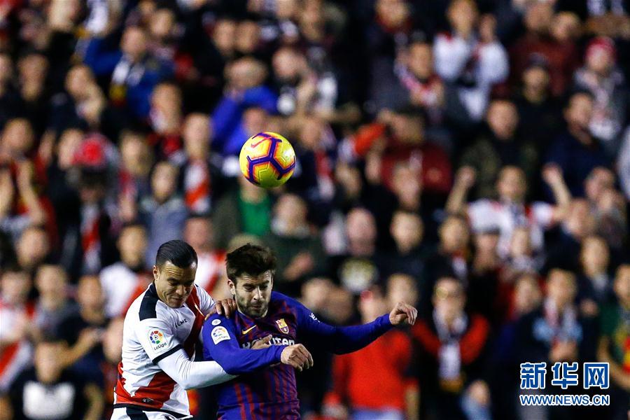 巴塞罗那队球员皮克(右)在比赛中和巴列卡诺队球员德托马斯拼抢。 新华社/法新