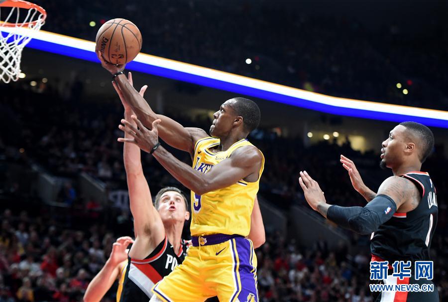 湖人队球员隆多(中)在比赛中上篮。新华社/路透