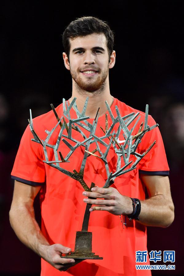 11月4日,卡恰诺夫在颁奖仪式上。 当日,在ATP巴黎大师赛单打决赛中,俄罗斯选手卡恰诺夫以2比0战胜塞尔维亚选手焦科维奇,夺得冠军。 新华社记者陈益宸摄