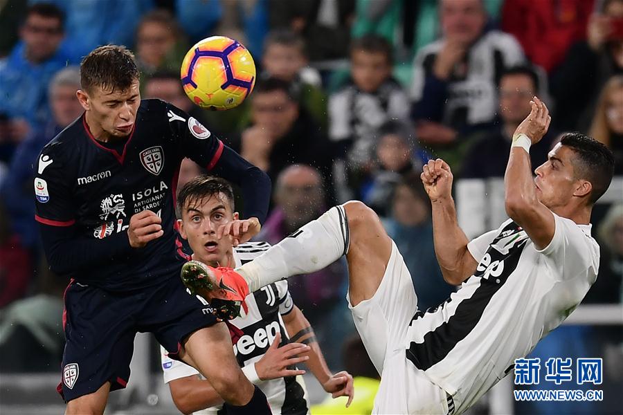 尤文图斯队球员克·罗纳尔多(右)在比赛中和卡利亚里队球员皮萨卡内(左)拼抢。新华社/法新