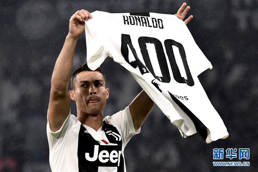 尤文图斯队球员克·罗纳尔多在赛前展示印有数字400的球衣,纪念他职业生涯进球数达到400粒。 新华社/法新