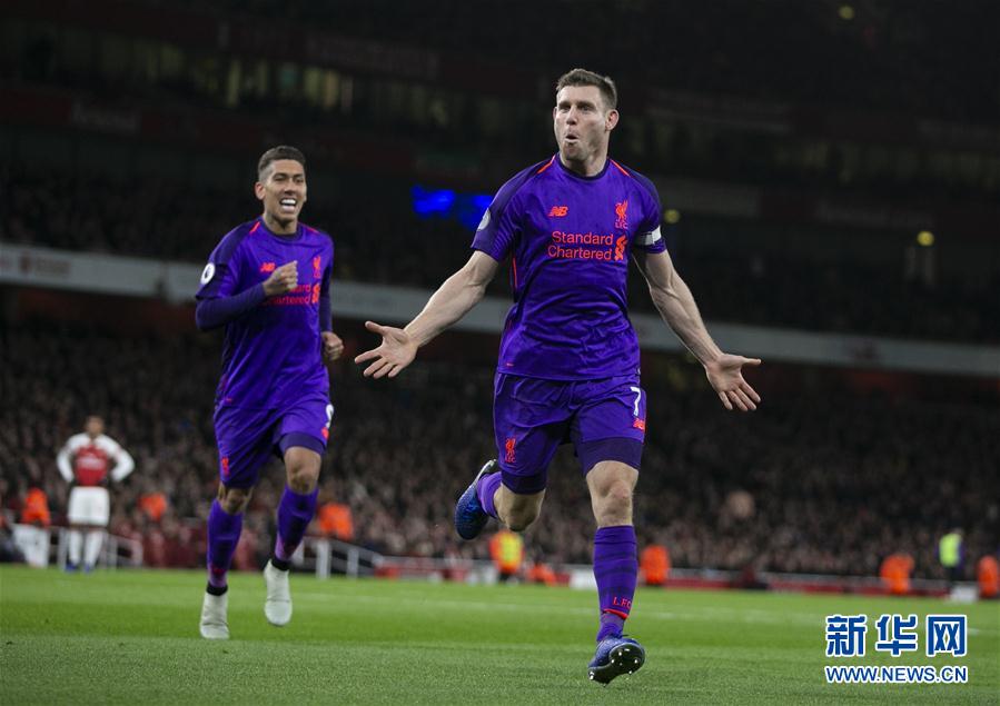 利物浦队球员米尔纳(右)在进球后庆祝。 新华社记者韩岩摄