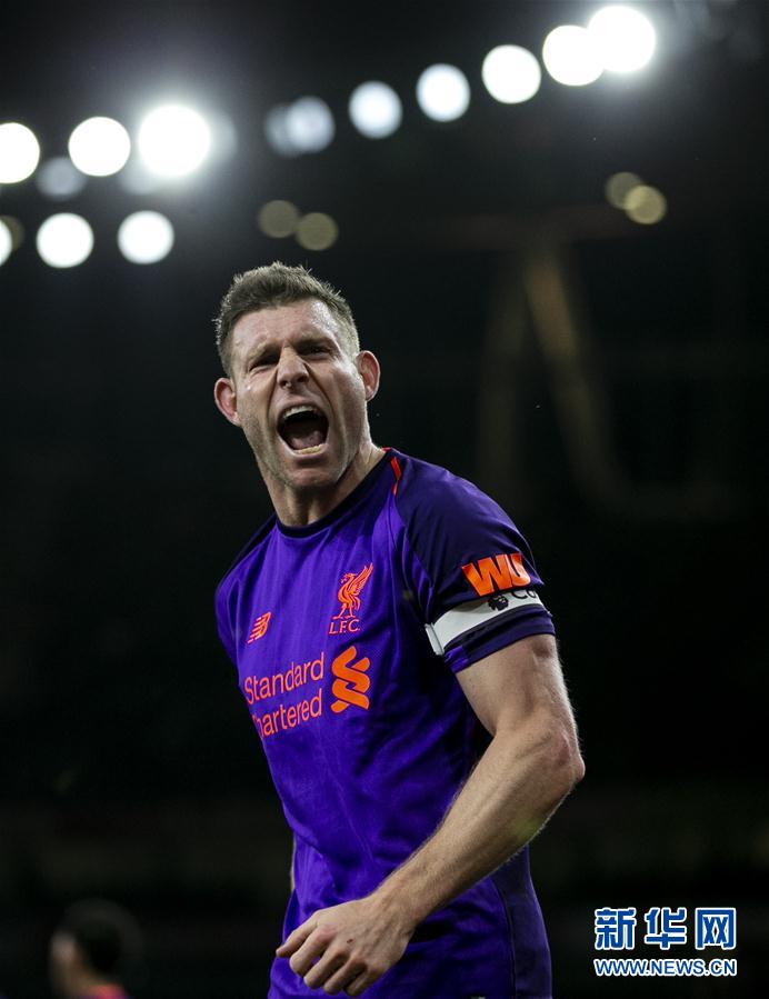 利物浦队球员米尔纳在进球后庆祝。新华社记者韩岩摄