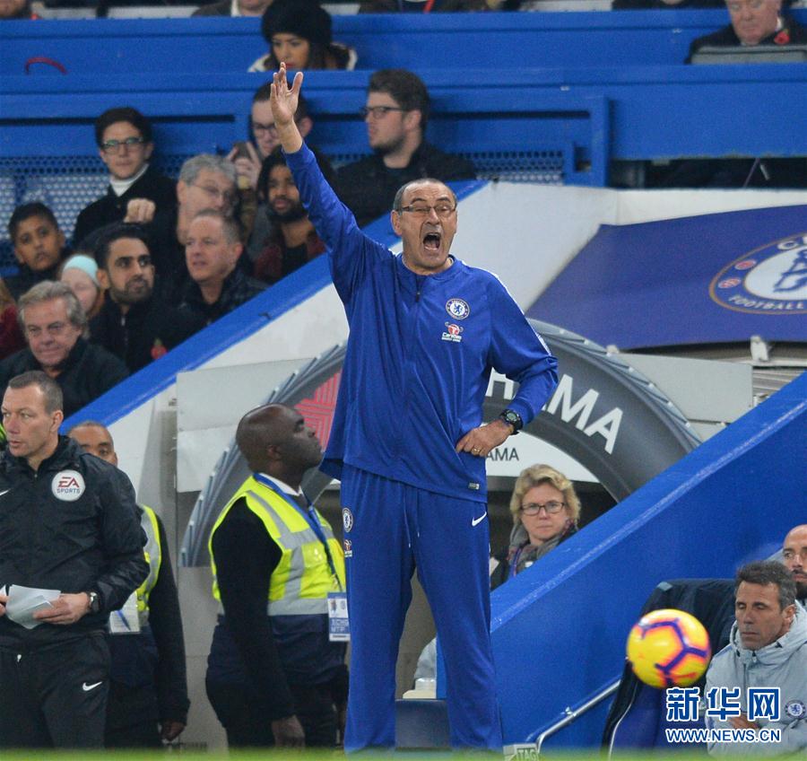 切尔西队主教练萨里在比赛中指挥。 当日,在2018-2019赛季英格兰足球超级联赛第11轮比赛中,切尔西队主场以3比1战胜水晶宫队。 新华社发