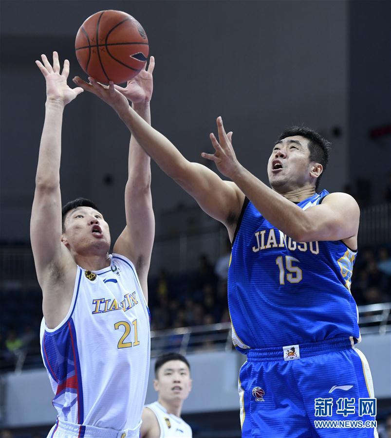11月6日,苏州肯帝亚队球员柳伟(右)在比赛中上篮。 当日,在2018-2019赛季中国男子篮球职业联赛(CBA)常规赛第八轮比赛中,天津滨海云商队主场以103比109不敌苏州肯帝亚队。 新华社记者岳月伟摄