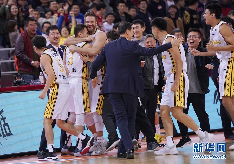 11月6日,北京农商银行队在获胜后庆祝。 当日,在2018-2019赛季中国男子篮球职业联赛(CBA)常规赛第八轮比赛中,北京农商银行队主场以132比131战胜时代中国广州队。 新华社记者鞠焕宗摄