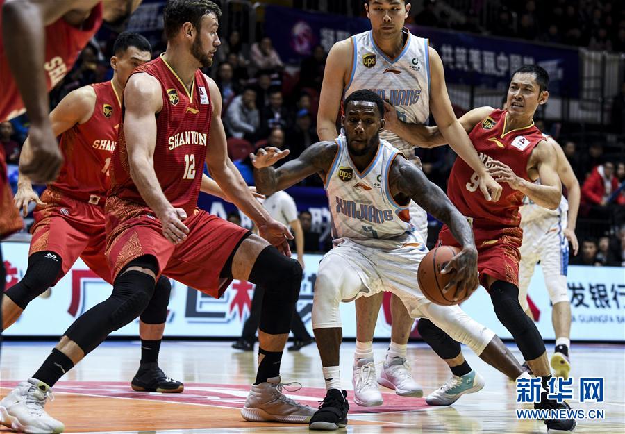 新疆广汇汽车队球员亚当斯(前右三)在比赛中突破。新华社记者王菲摄