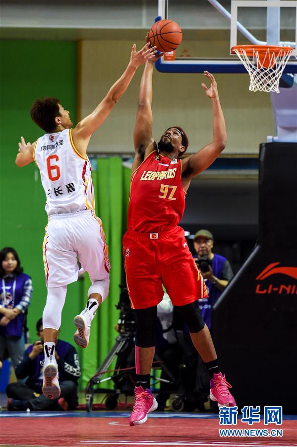深圳马可波罗队球员萨林杰(右)在比赛中封盖南京同曦大圣队球员于长春。新华社记者李博摄