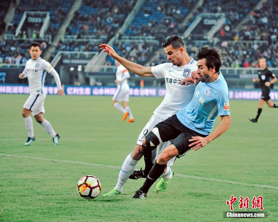 11月7日,天津泰达队球员乔纳森(白)与大连一方队球员盖坦(蓝)在比赛中争球。当晚,在2018赛季中超联赛第29轮比赛中,天津泰达队主场以3比1战胜大连一方队。中新社记者 佟郁 摄