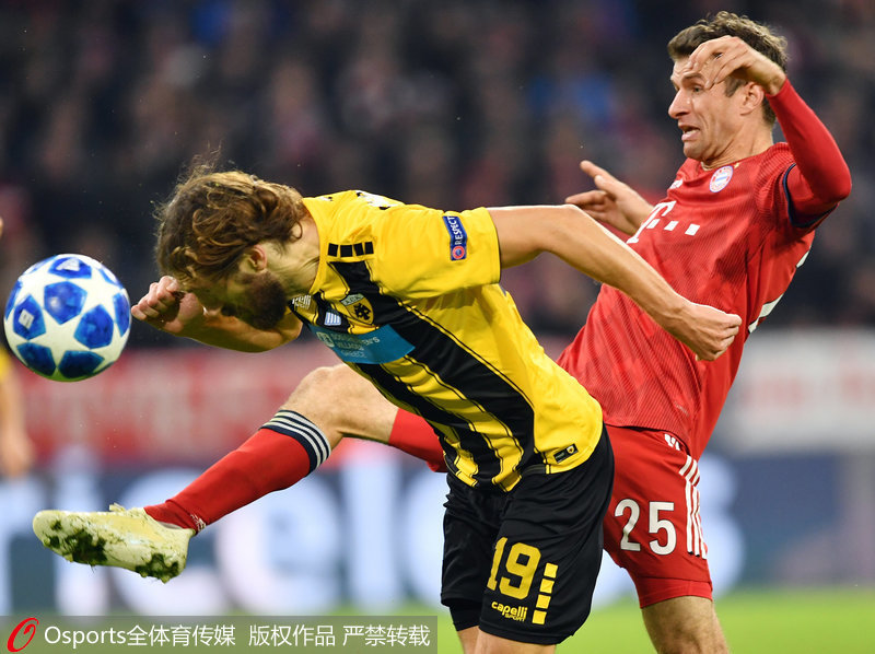 第37分钟,大禁区前的莱万多夫斯基将球顺势一塞,插上的穆勒一脚低射被防守队员挡出。半场战罢,拜仁主场暂时1-0领先于雅典AEK。