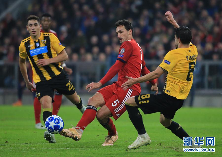 拜仁慕尼黑队球员胡梅尔斯(右二)与雅典AEK队球员西蒙斯(右一)在比赛中拼抢。新华社发