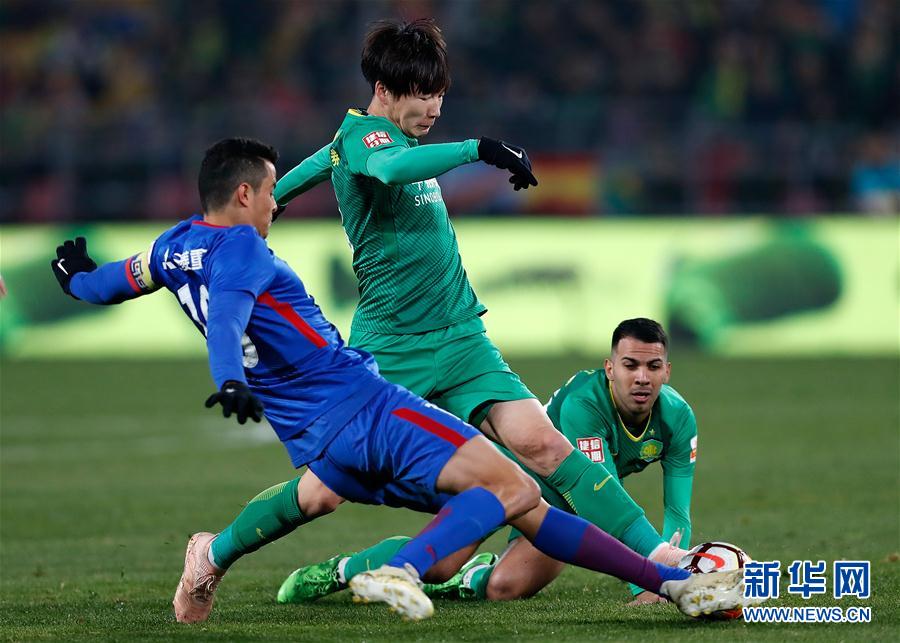 北京国安队球员朴成(中)与上海绿地申花队球员莫雷诺(左)在比赛中争抢。 新华社记者王丽莉摄