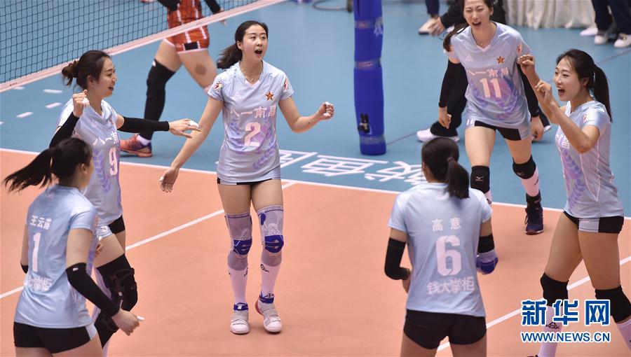 11月8日,八一南昌队球员在比赛中庆祝得分。 当日,在2018-2019赛季中国女排超级联赛第一阶段分组赛A组第一轮比赛中,八一南昌队以3比0战胜河南银鸽投资队。 新华社记者姚剑锋摄