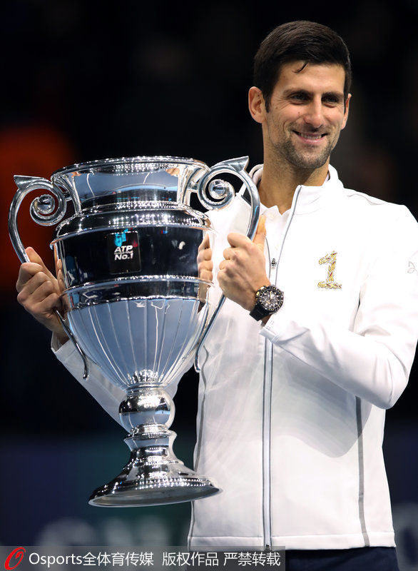 人民网北京11月12日电 北京时间11月11日,2018年ATP年终总决赛在伦敦举行。在首日日场比赛结束后,举行了年终第一的颁奖仪式。现排名世界第一的塞尔维亚名将德约科维奇举起了奖杯,这也是德约科维奇第五次成为年终第一,追平了费德勒、康纳斯,仅次于桑普拉斯位列史上第二。