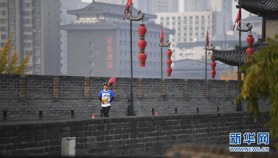 11月11日,参赛选手在比赛中。 当日,2018西安城墙秋季半程国际马拉松赛在西安市明城墙永宁门鸣枪开跑。本次比赛设置了半程马拉松、环城跑和5公里欢乐跑三个项目。 新华社记者张博文摄