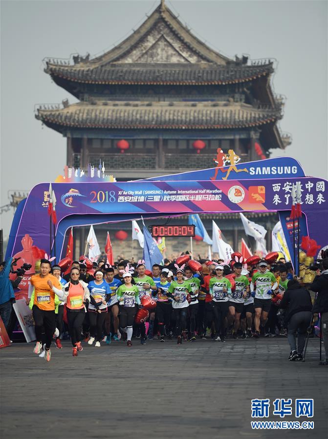 11月11日,参赛选手从起点出发。 当日,2018西安城墙秋季半程国际马拉松赛在西安市明城墙永宁门鸣枪开跑。本次比赛设置了半程马拉松、环城跑和5公里欢乐跑三个项目。 新华社记者张博文摄