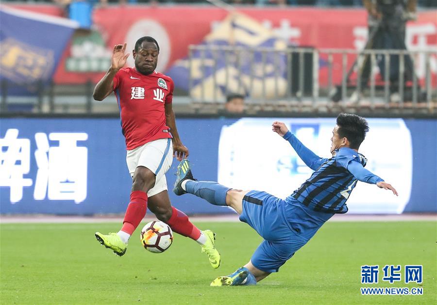 河南建业队球员巴索戈(左)在比赛中突破江苏苏宁易购队球员李昂的防守。新华社记者杨磊摄