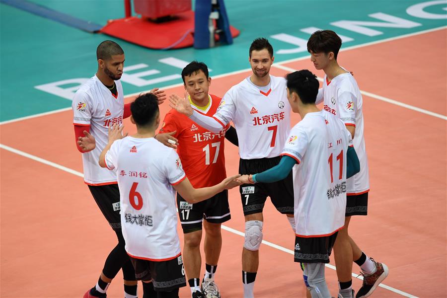 11月11日,北京汽车队球员庆祝得分。 当日,在2018-2019中国男子排球超级联赛第二阶段排位赛第一轮比赛中,北京汽车队主场以3比0战胜八一南昌队。 新华社记者李俊东摄