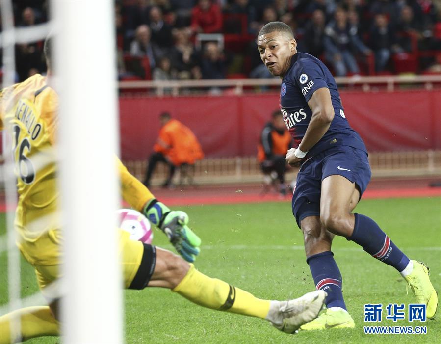 11月11日,巴黎圣日耳曼队球员姆巴佩(右)在比赛中射门。 当日,在2018-2019赛季法国足球甲级联赛第13轮比赛中,巴黎圣日耳曼队客场以4比0战胜摩纳哥队。 新华社发