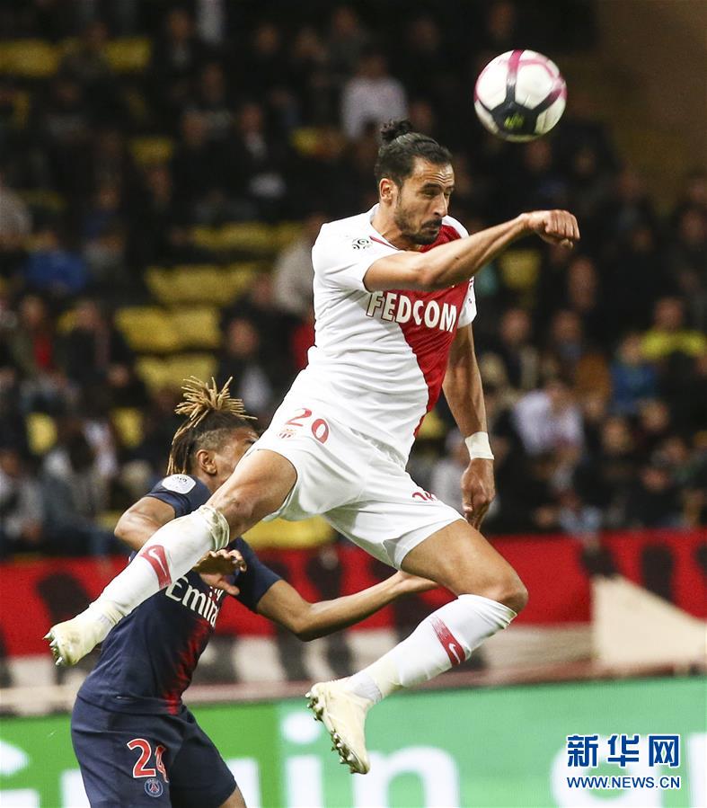 巴黎圣日耳曼队球员恩昆库(左)与摩纳哥球员沙兹利在比赛中争顶。新华社发