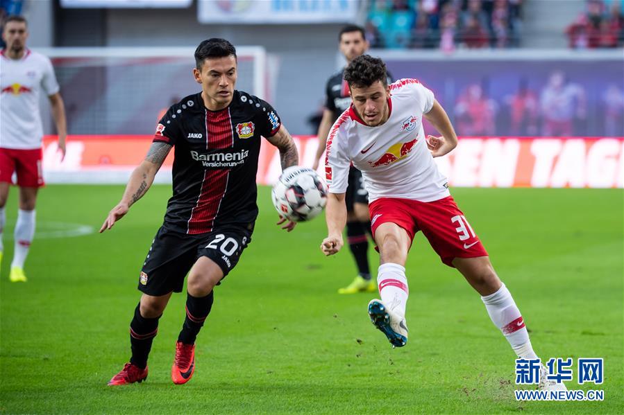 莱比锡队球员德默(右)与勒沃库森队球员阿朗吉斯在比赛中拼抢。 新华社发