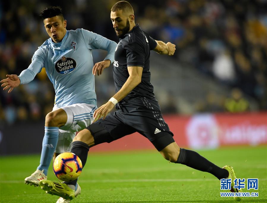 皇马队球员本泽马(右)与维戈塞尔塔队球员龙卡利亚在比赛中拼抢。 新华社/法新