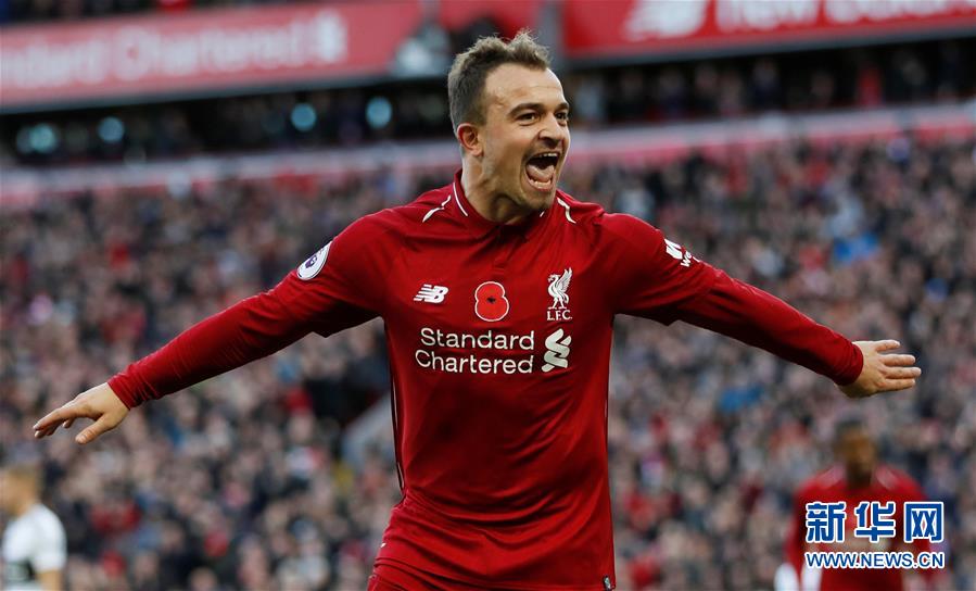 11月11日,利物浦队球员沙奇里庆祝进球。 当日,在2018/2019赛季英格兰足球超级联赛第12轮比赛中,利物浦队主场以2比0战胜富勒姆队。 新华社/路透