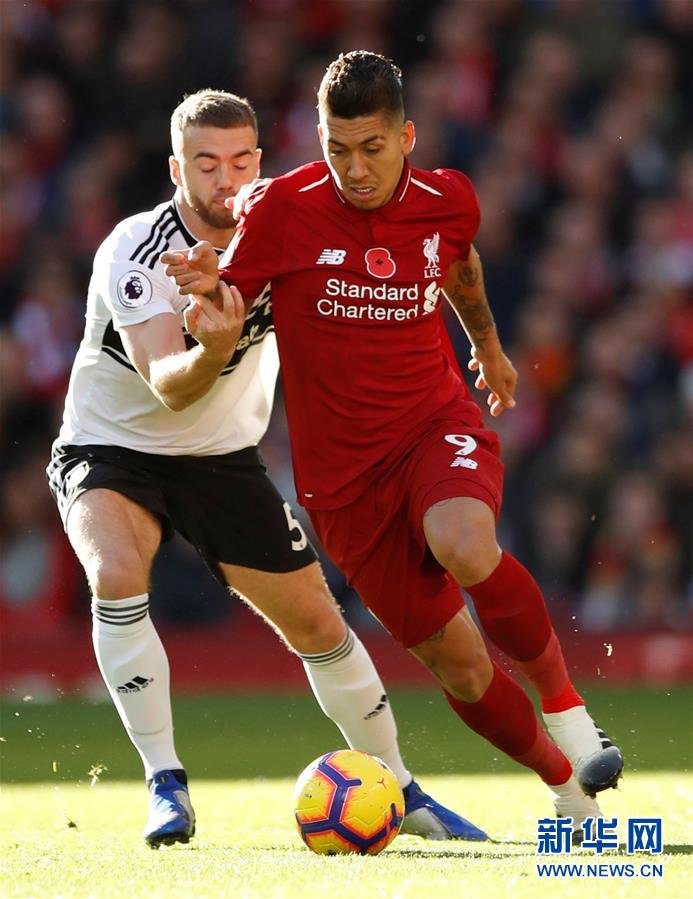 利物浦队球员菲尔米诺(右)与富勒姆队球员钱伯斯在比赛中拼抢。新华社/路透