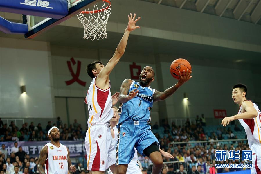 11月11日,北京首钢队球员艾伦·杰克逊(中)在比赛中进攻。 当日,在2018-2019赛季中国男子篮球职业联赛(CBA)第十轮比赛中,北京首钢队客场以114比109战胜浙江稠州银行队。 新华社发