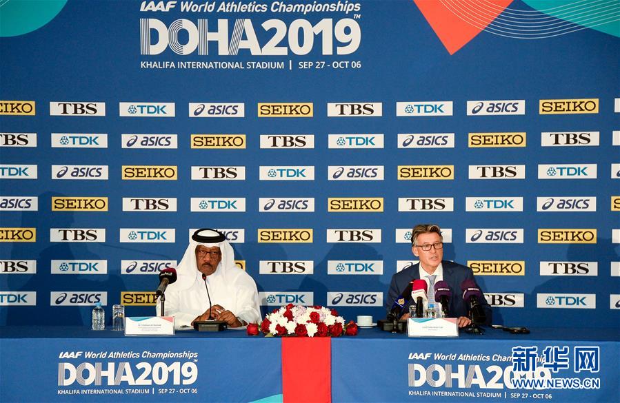 11月11日,国际田联副主席达赫兰(左)和国际田联主席塞巴斯蒂安·科出席新闻发布会。 当日,国际田联2019年多哈世锦赛新闻发布会在卡塔尔首都多哈举行。 新华社发