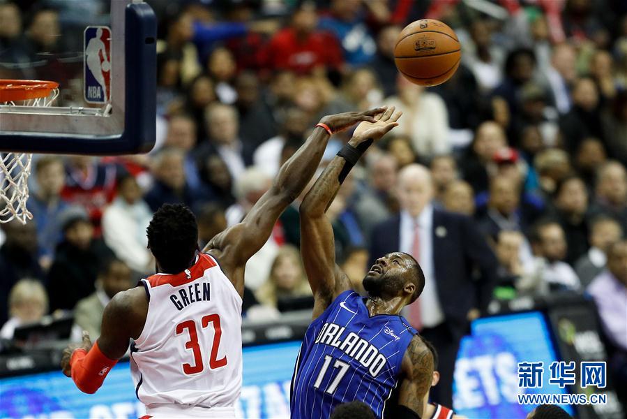奇才队球员格林(左)在比赛中防守魔术队球员西蒙斯。新华社发