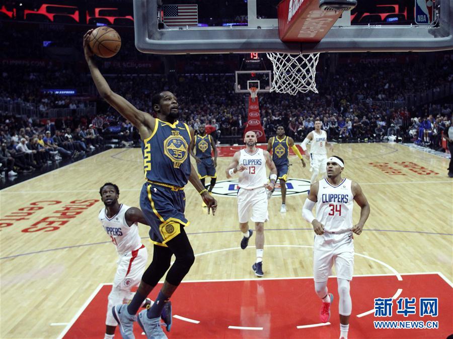 11月12日,勇士队球员杜兰特(左二)在比赛中扣篮。新华社发(赵汉荣摄)