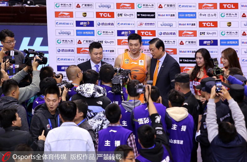 赛后,上海男篮主帅李秋平为刘炜颁发万分纪念篮球。