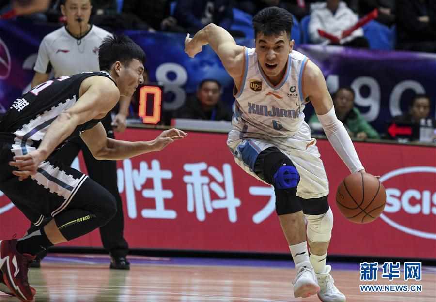 11月13日,新疆广汇汽车队球员曾令旭(右)在比赛中进攻。 当日,在2018-2019赛季中国男子篮球职业联赛(CBA)第11轮比赛中,新疆广汇汽车队主场以124比119战胜辽宁本钢队。 新华社记者王菲摄