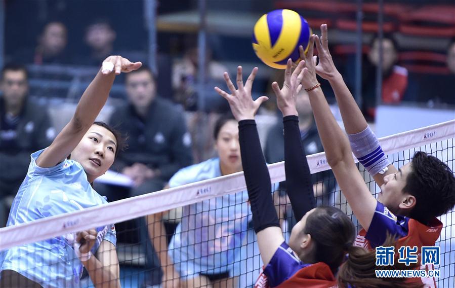八一南昌队球员袁心玥(左一)在比赛中扣球。 新华社记者姚剑锋摄