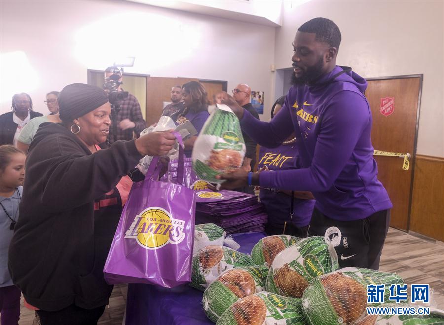 湖人队球员斯蒂芬森(右一)与队友波普(右二)与志愿者在活动中合影。 新华社发