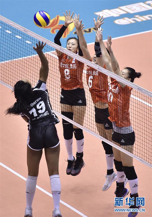 11月14日,辽宁营口鲅鱼圈队球员丁霞(左二)、胡铭媛(右二)、段放(右一)在比赛中拦网。 当日,在2018-2019赛季中国女排超级联赛第一阶段精英赛A组第七轮比赛中,辽宁营口鲅鱼圈队以3比0战胜河南银鸽投资队。 新华社记者姚剑锋摄