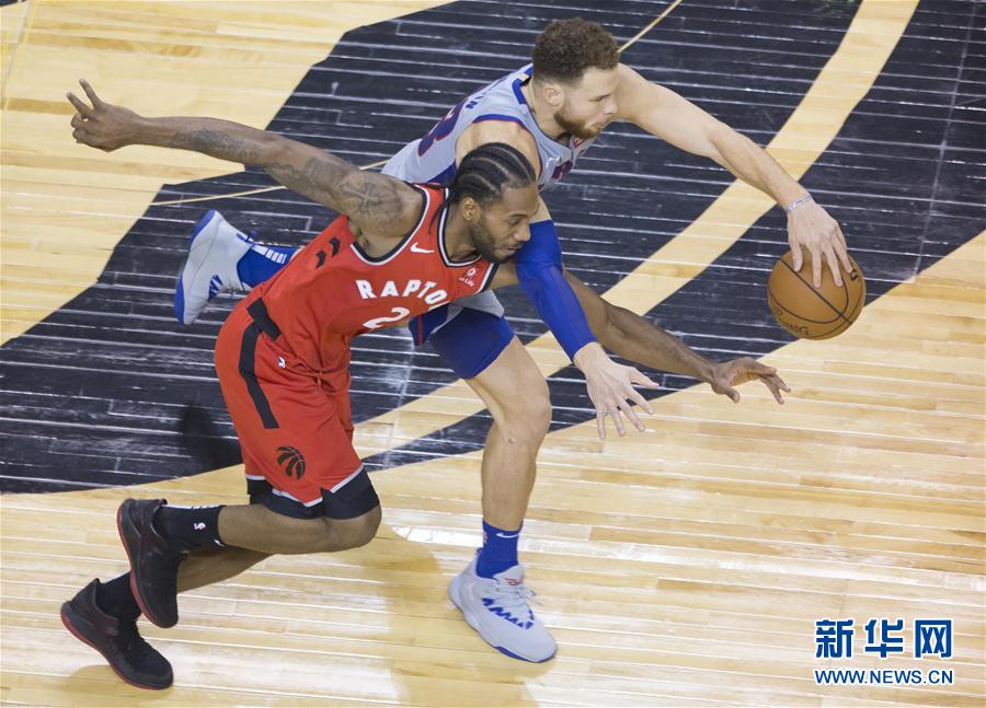 11月14日,活塞队球员格里芬(后)在比赛中和猛龙队球员莱昂纳德拼抢。 当日,在2018-2019赛季NBA常规赛中,多伦多猛龙队主场以104比106不敌底特律活塞队。 新华社发