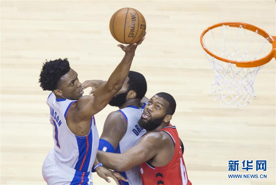 活塞队球员斯坦利·约翰逊(左)在比赛中上篮。 新华社发