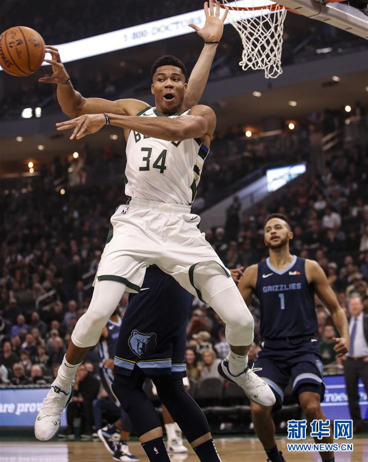 11月14日,雄鹿队球员安特托昆博(上)在比赛中传球。 当日,在2018-2019赛季NBA常规赛中,孟菲斯灰熊队客场以116比113战胜密尔沃基雄鹿队。 新华社发