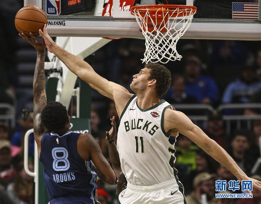 雄鹿队球员洛佩斯(右)在比赛中防守灰熊队球员布鲁克斯。 新华社发