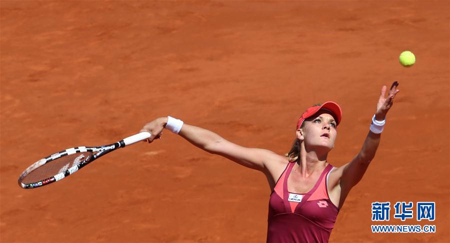 2013年6月4日,波兰选手拉德万斯卡在2013年法国网球公开赛女单四分之一决赛对阵意大利选手埃拉尼的比赛中发球。 新华社记者高静摄